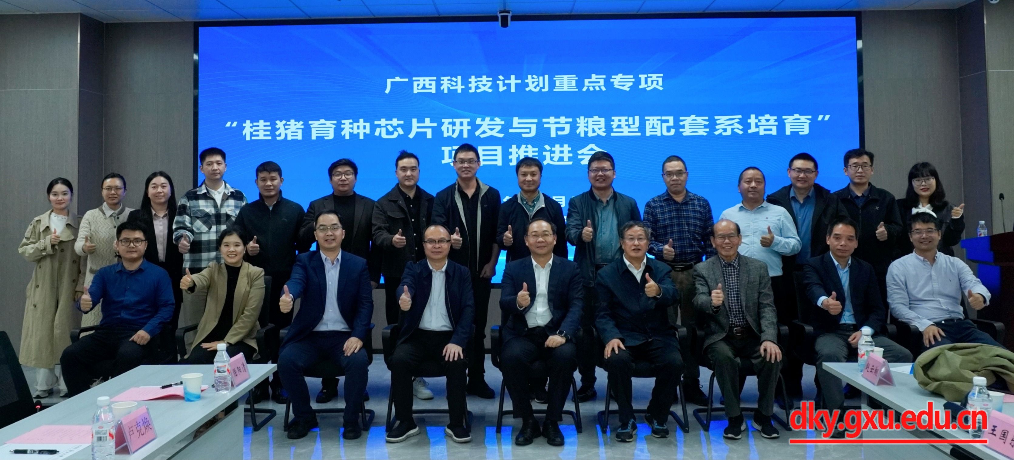 11月5日,我校召开广西科技计划重点专项“桂猪育种芯片研发与节粮型配套系培育”2025年项目推进会。中国工程院院士、中国科学院亚热带农业生态研究所研究员印遇龙,广西大学副校长于文进,自治区农业农村厅科技处副处长王国乐出席会议并致辞。广西大学万象城院长陆阳清主持开幕式。广西大学原副校长卢克焕,自治区农业农村厅农垦处一级调研员卢玉发,广西大学科研院项目管理处副处长张敏,广西大学万象城副院长何家康,广西大学万象城教授、项目负责人赵云翔及来自8家项目参与单位的科研骨干人员参加会议。