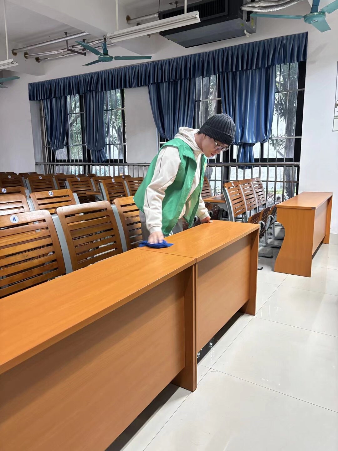 活动现场,研究生志愿者们手持各类清洁工具,迅速且有序地投入到劳动中。他们分工明确、协作默契,以高度的责任感和饱满的热情投入到每一项清洁任务中。经过两个多小时的辛勤付出,教室环境焕然一新,原本有些杂乱的教室变得窗明几净、整洁有序,为同学们营造出了更加舒适的学习环境。